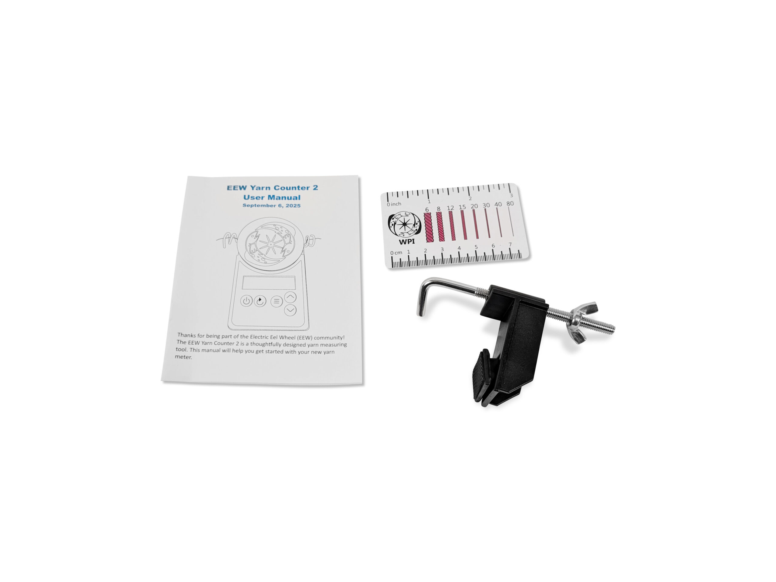 The EEW Yarn Counter helps you measure and track yarn for a variety of tasks — from dividing yarn for socks, quilts, or 2-ply projects, to monitoring usage and assisting with weavers’ sectional warping.